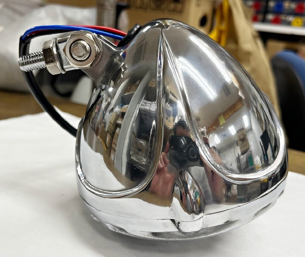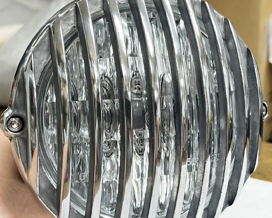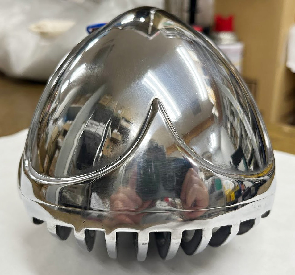 新品、ボディとケージグリルはアルミ無垢ポリッシュ、ガラスレンズ。