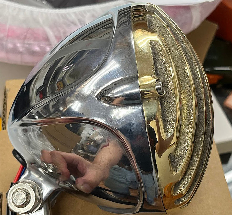 新品、ボディはアルミ無垢ポリッシュ、ケージグリルは真鍮無垢ポリッシュ、ガラスレンズ。