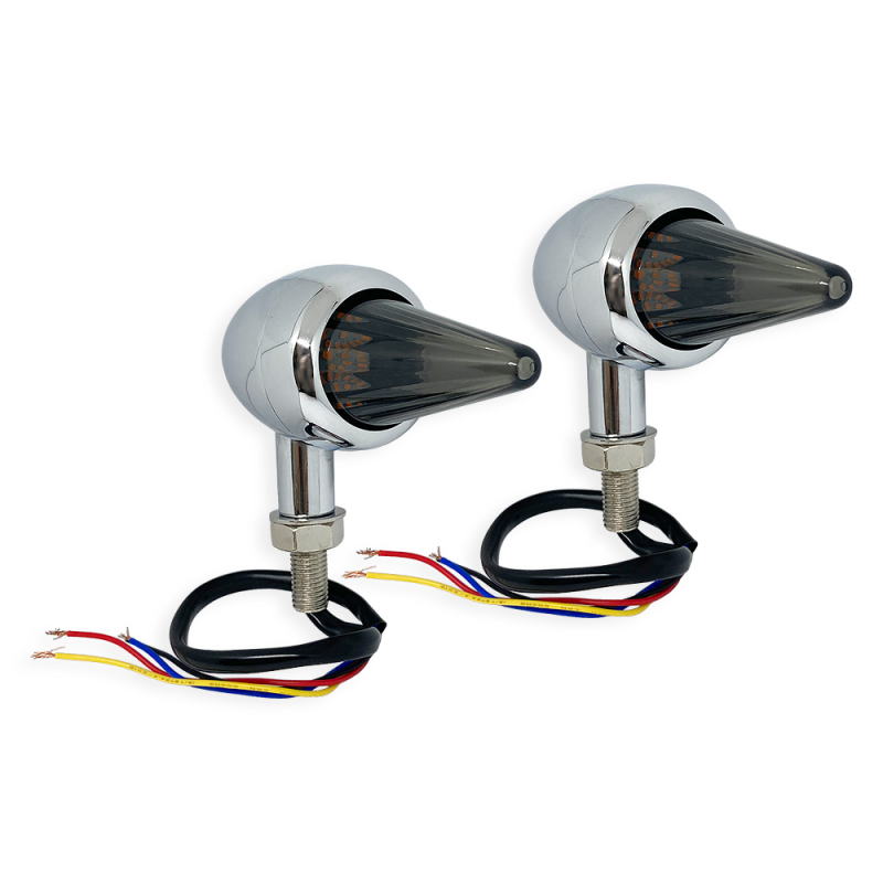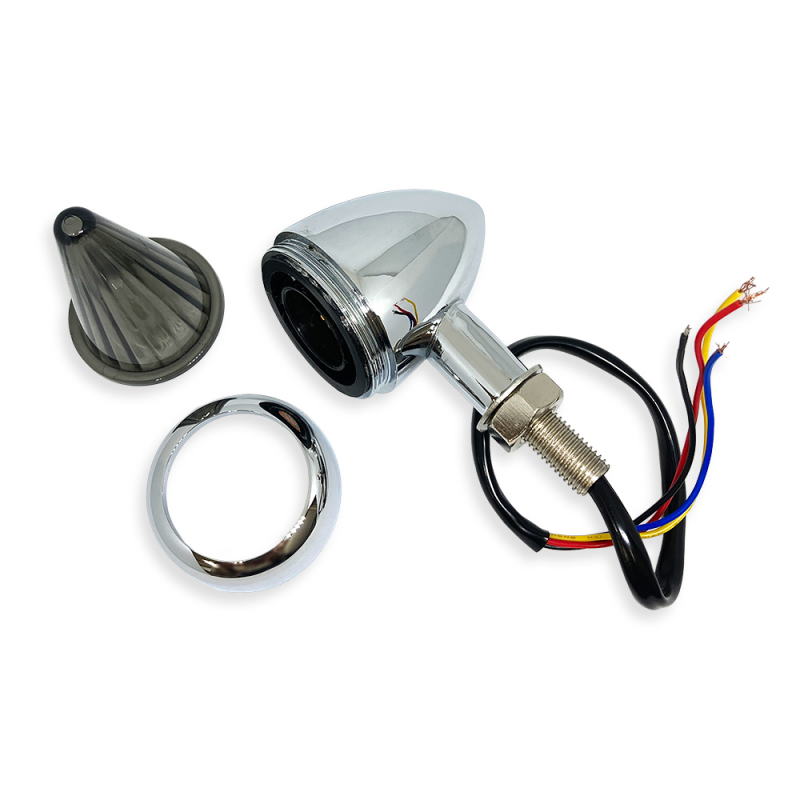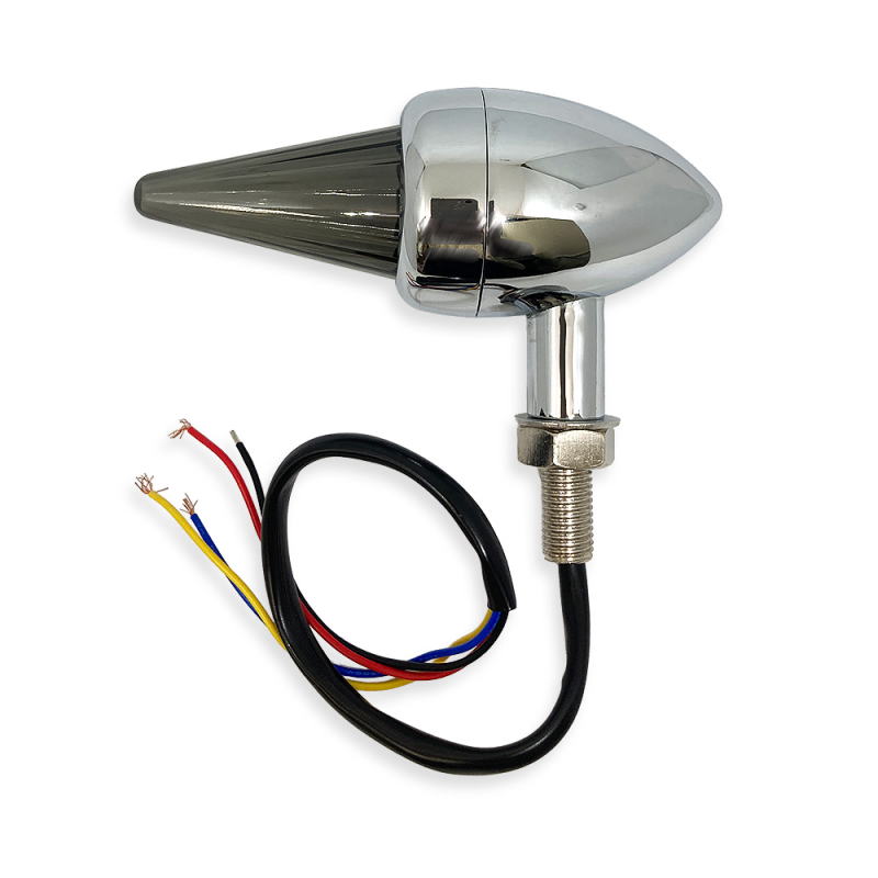 | 2個ペアのお値段です。 左右兼用 足とボディ部分は合金製のクロームメッキです。 レンズはABS製。 電球は12vのLED。 配線は、黒はアース、黄色は点滅、赤は点灯明るい、青は点灯暗い、です。 ボディ部分:全長:111mm 最大直径:44mm レンズ部 直径(約)30mm ボルトナットはM9 足根元に作製時行程にてちょっと凹み有。 スモーク色で、電球は白色に近い黄色なので旧車用Fウインカーなどにいかがでしょう? 画像のみのご判断によりノークレームノーリターンでお願いいたします。 参考になるかわかりませんが説明の動画はこちら |