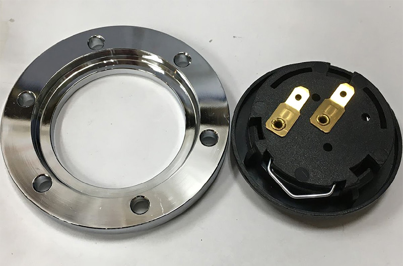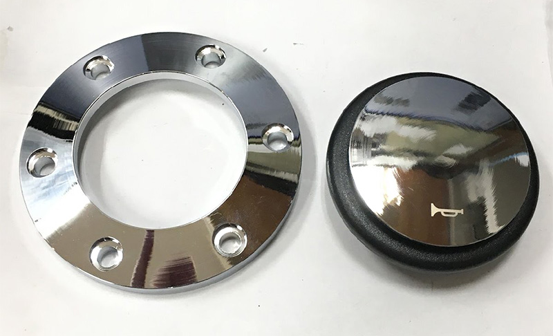 | アルミニウム削り出し&クロームメッキのビレットホーンボタンです。通常のプラスチックのペッタンコとは違い凸タイプです。 アルミ削り出しなので若干のヘアライン傷はご了承ください。 プラスチックより断然カッコいいですよ!!!! 表側の最大直径84.2mm ボタン部分直径50.5mm ス テアリングにはめたときに出っ張る高さ約12mm 裏側の黒いはめ込みの奥行(端子含む)13mm 裏側のステアリングボスにはめる黒い部分の直径55mm 2つに分解後、ホーンボタンをステアリングの上から、ホーンボタンカバーをネジでステアリングとボスを共留めする形となります。 こちらでも通電テストをしておりますが、取り付け前に通電テストをしてから取り付けにかかってください、 取り付けにかかった時点で返品クレームは受け付けません。 発送は宅急便とクリックポストが選べますが、 クリックポストの場合裏側のギボシがちょっとつぶれる可能性 (到着後ちょい起こせば済むことですが)がありますのでご了承ください。