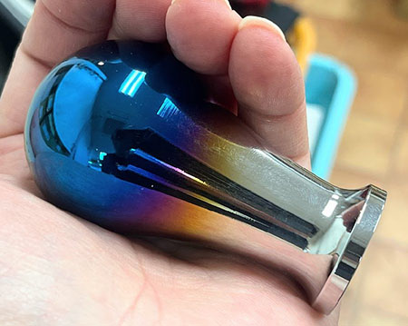 ステンレス製に焼き付けしたハンドメイドのシフトノブです。チタン風な青みがかった虹色で渋いです! 無垢削り出しなので微量な線傷等はご了承下さい。 高さ 最大約80mm、 直径 最大約43.5mm 黒いPVC製アダプターは内径8mm、10mm、12mm(ネジ切はされておりませんの何かを巻いたりしてうまく調整して下さい)で最後にシフトノブごとで締め上げるタイプです。 またテーパがかかっていますので無理やり最後までねじ込まずある程度で切り取って下さい。 車検時はマーク付けてください。 スベスベして握りやすいですよ!! |
